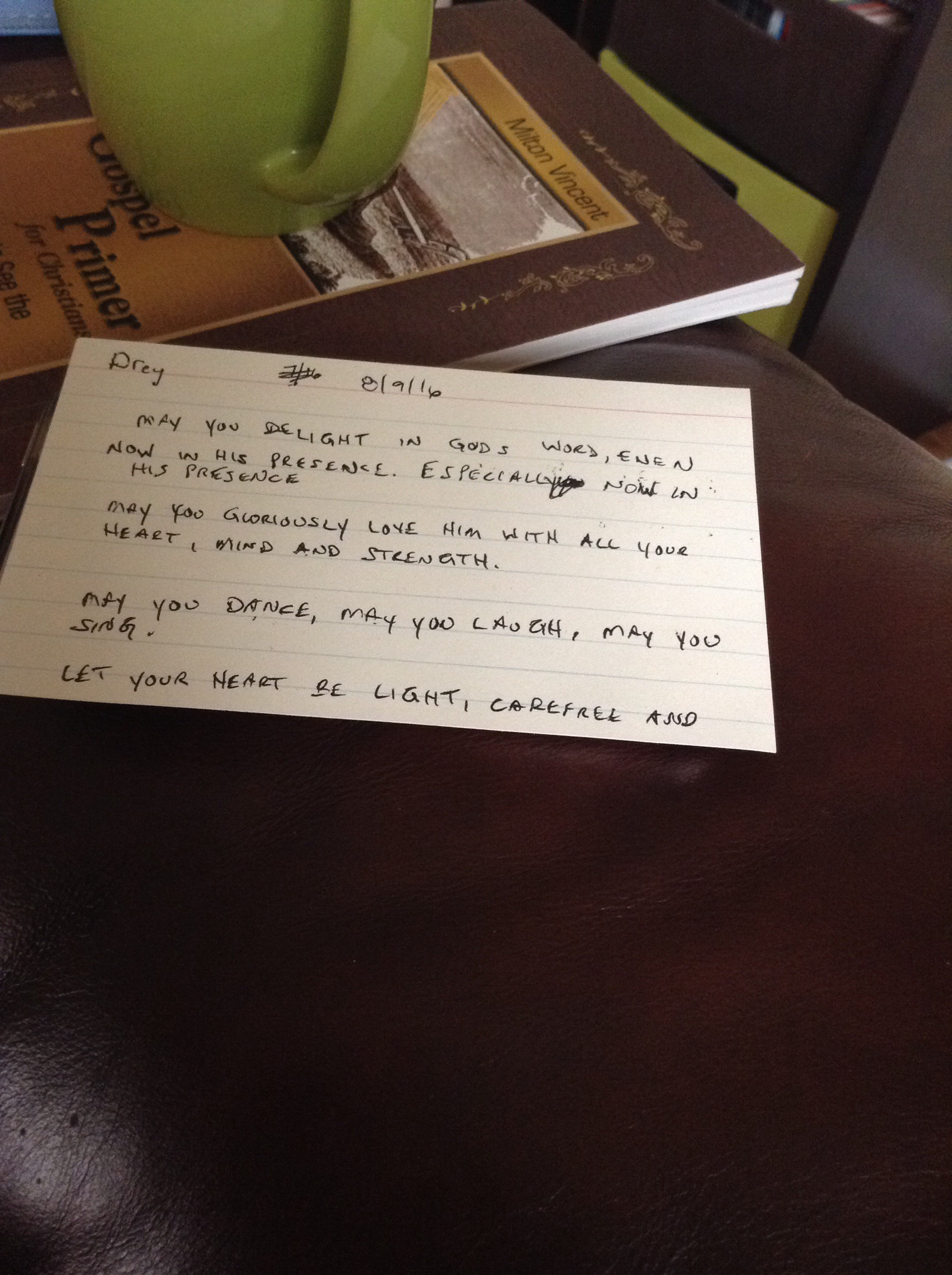“Drey may you delight in Gods Word even now in His presence. Especially now in His presence. May you gloriously love Him with all your heart, mind and strength. May you dance, may you laugh, may you sing. Let your heart be light, carefree and full of worship and praise. Rejoice!”
